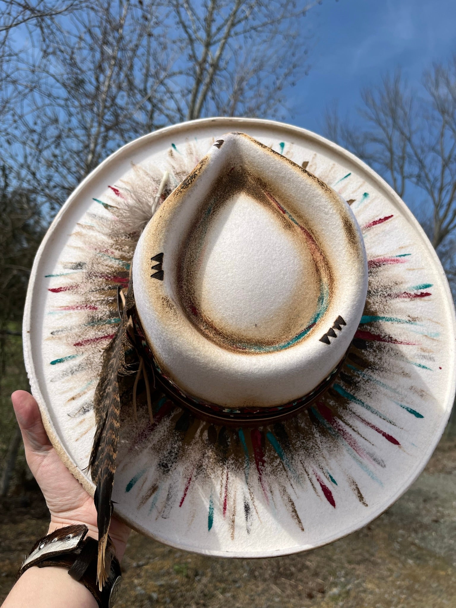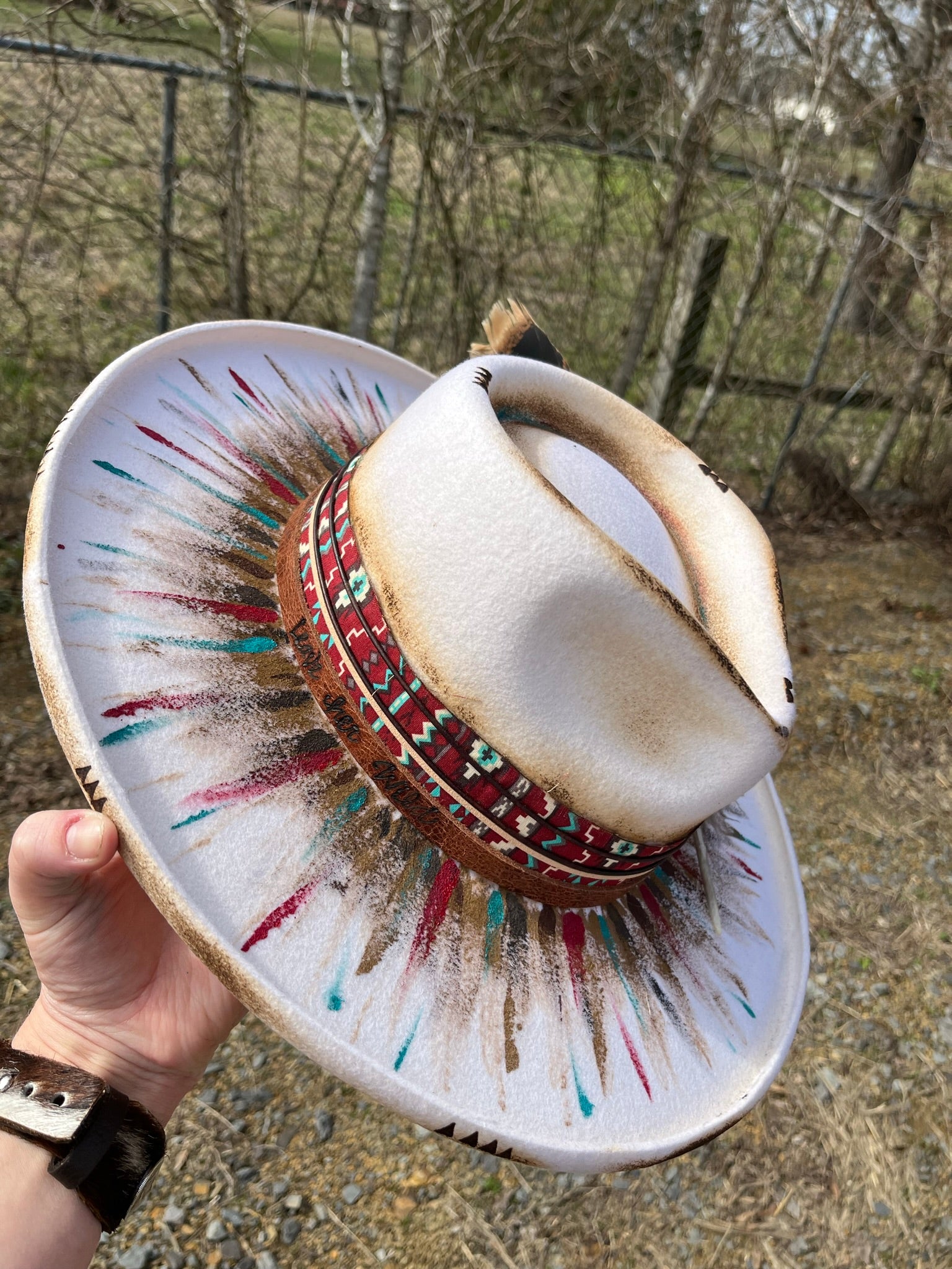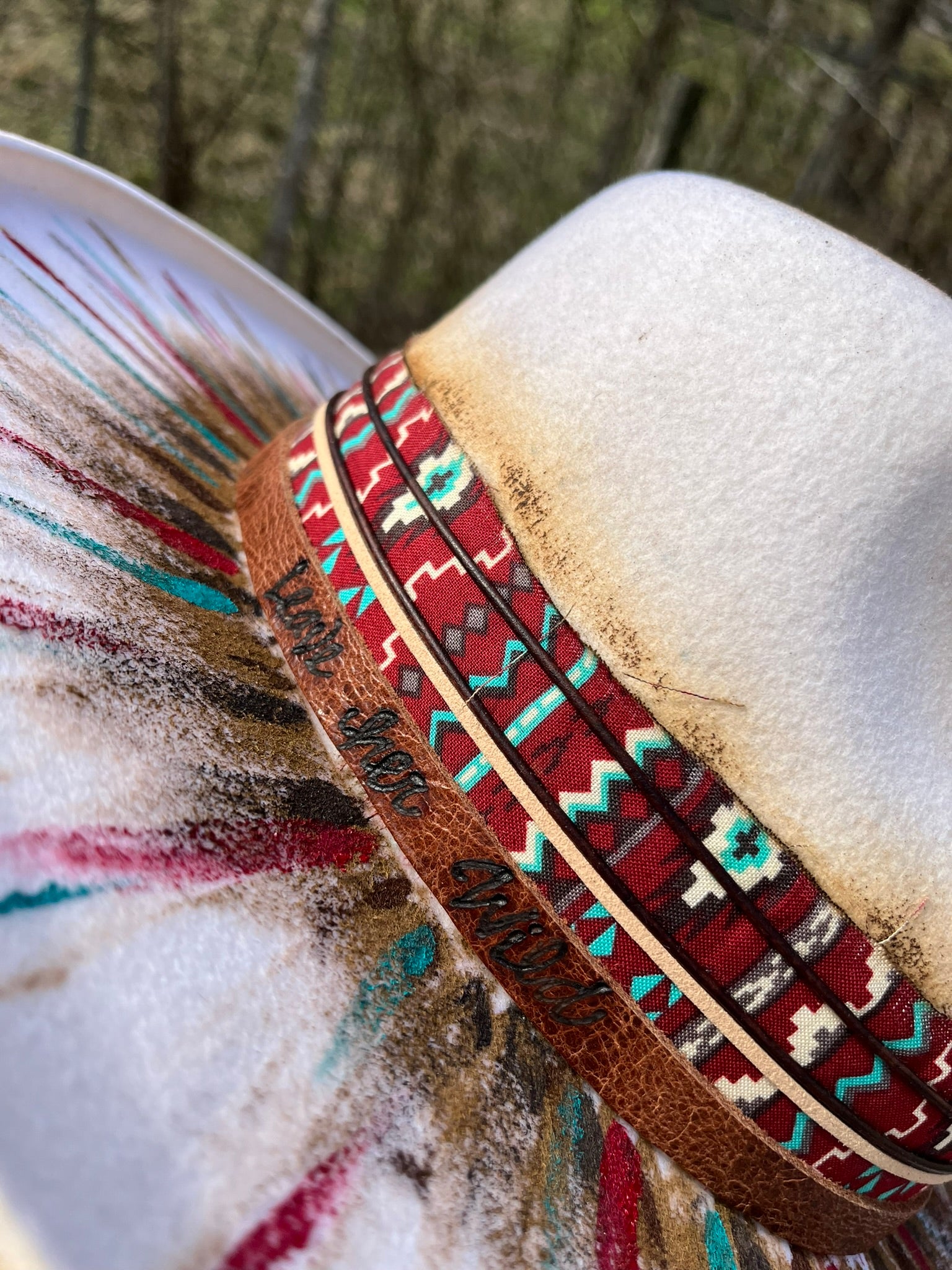 White in color, this hat has been hand painted with non-bleeding/water resistant paint. Hand burning accents have been added.