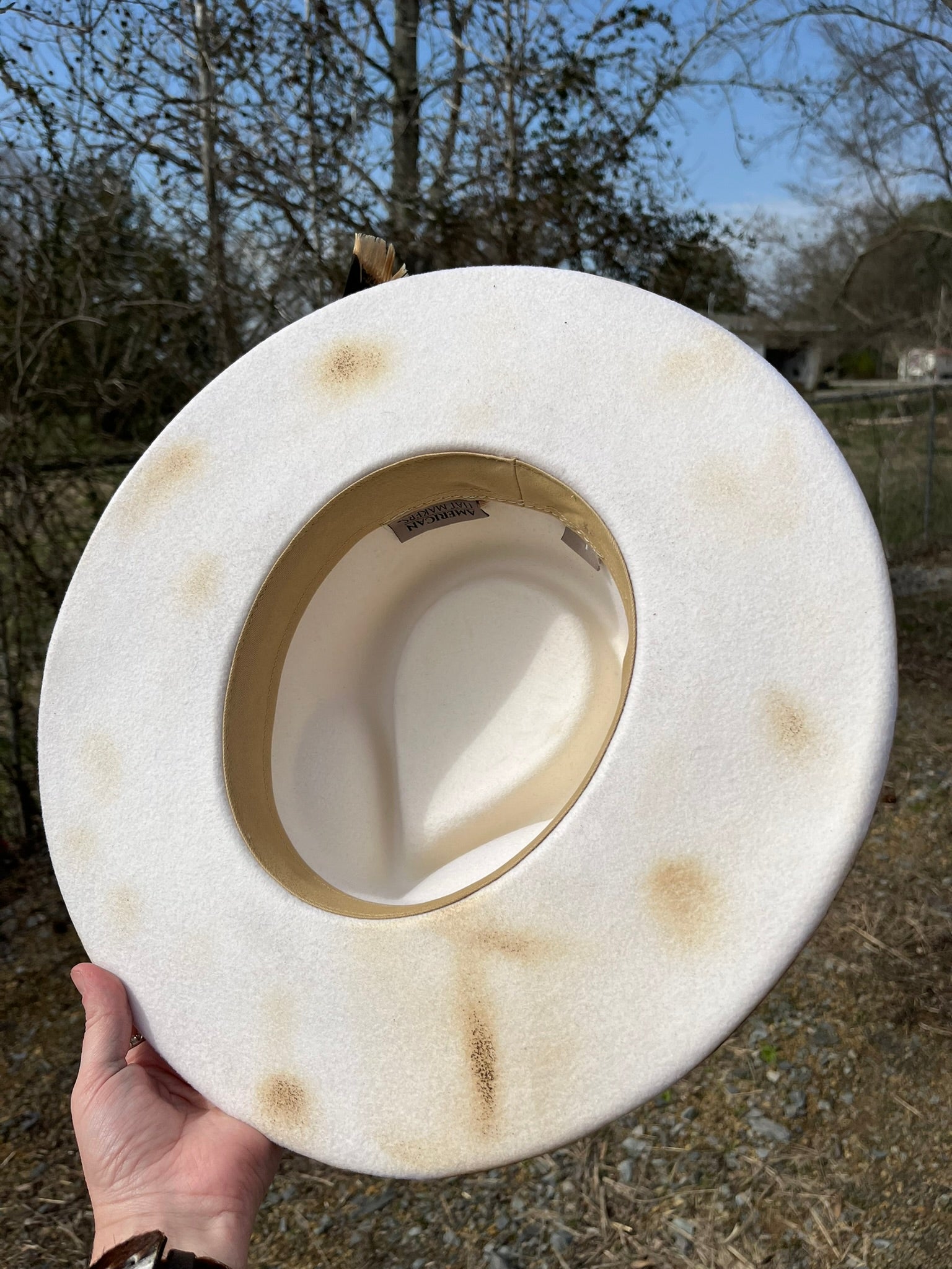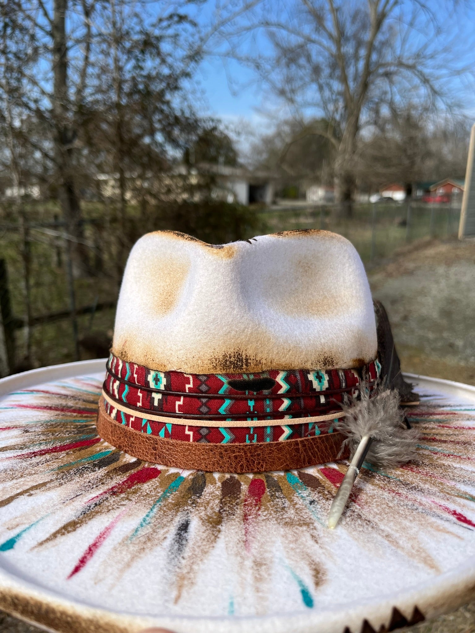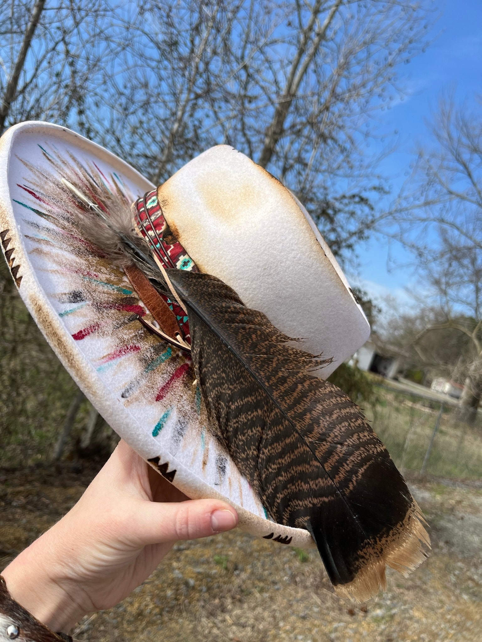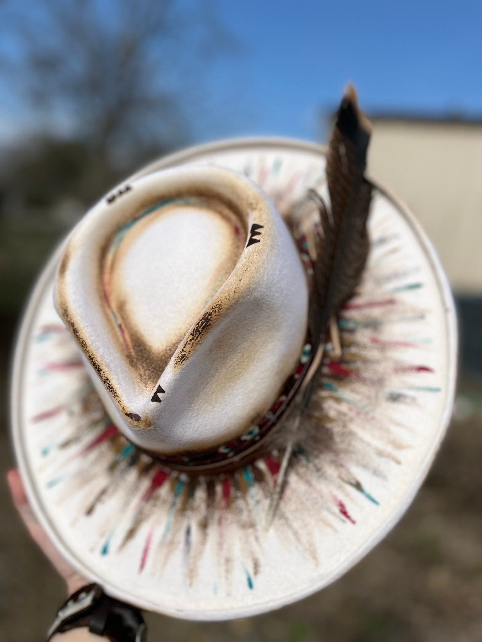 White in color, this hat has been hand painted with non-bleeding/water resistant paint. Hand burning accents have been added.