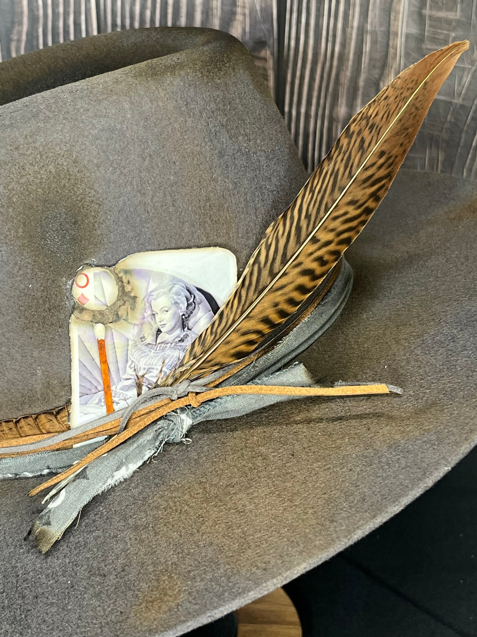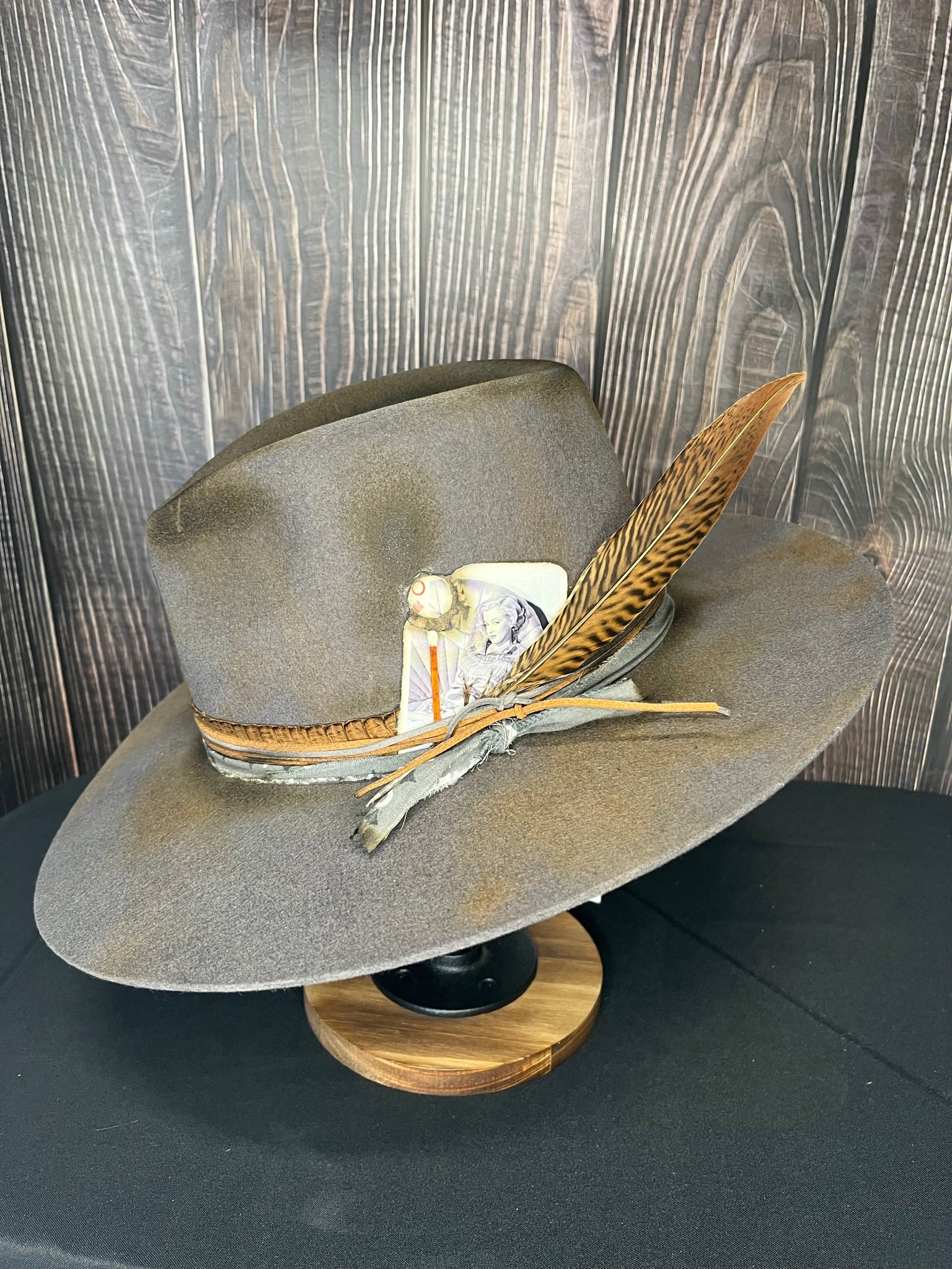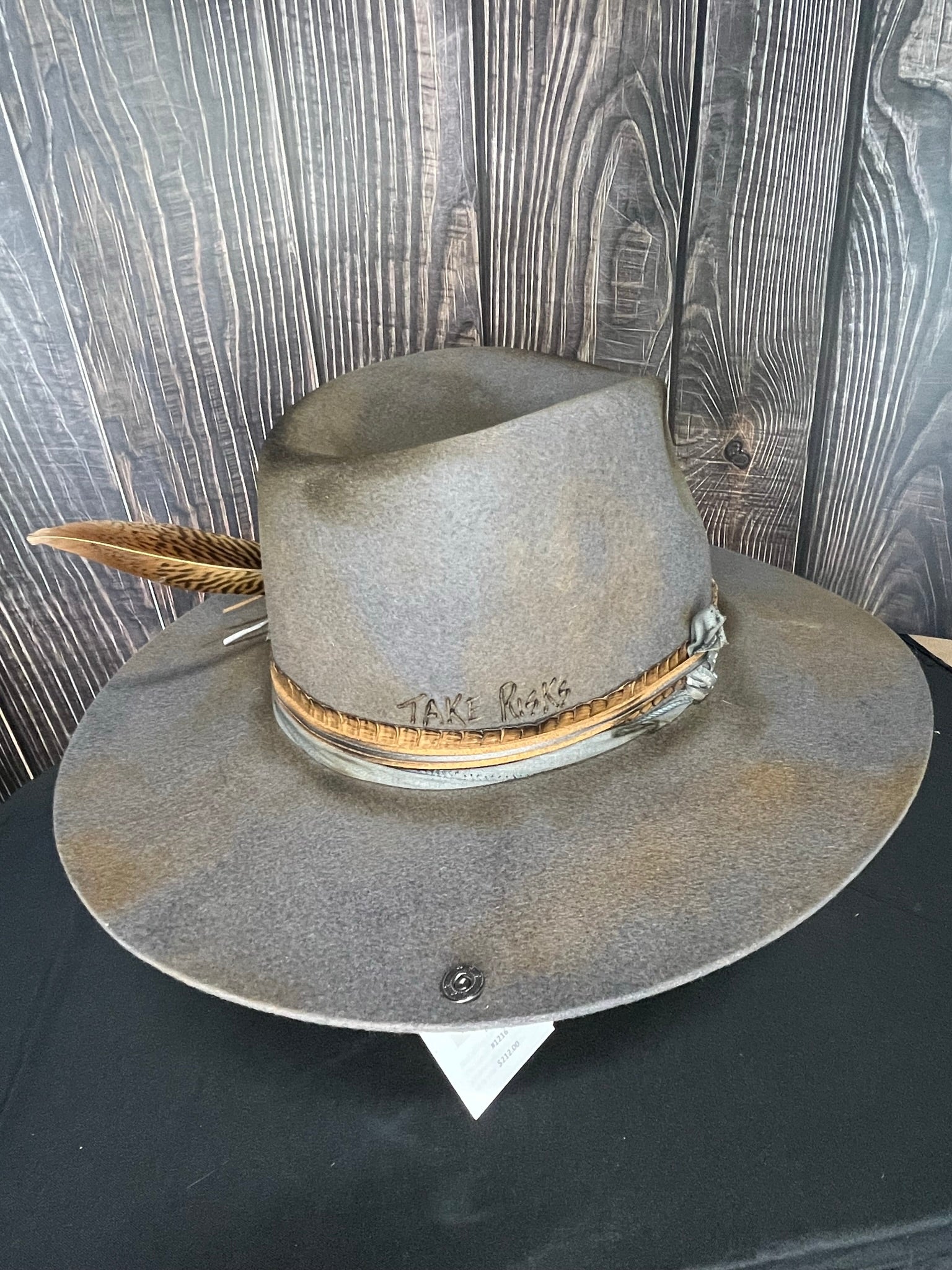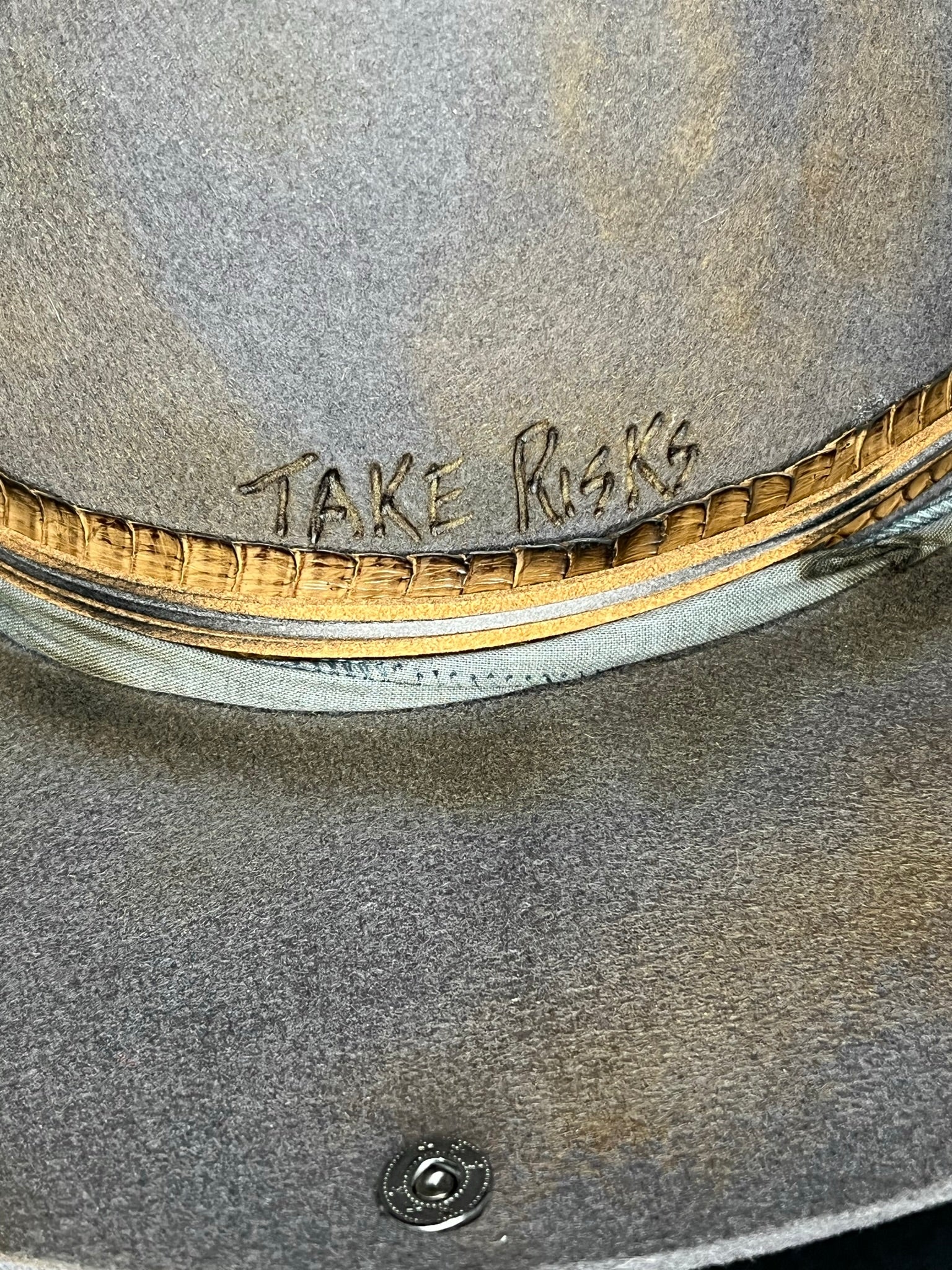 Grey in color, this hat has been accent painted and all over burned. Along with some accent burning. "Take Risks" hand burned onto the back right.