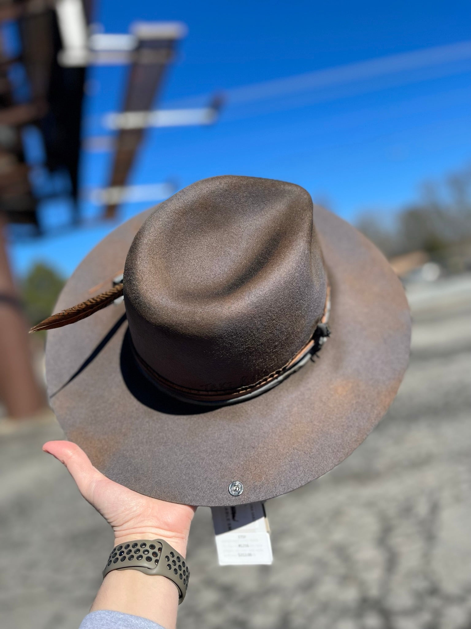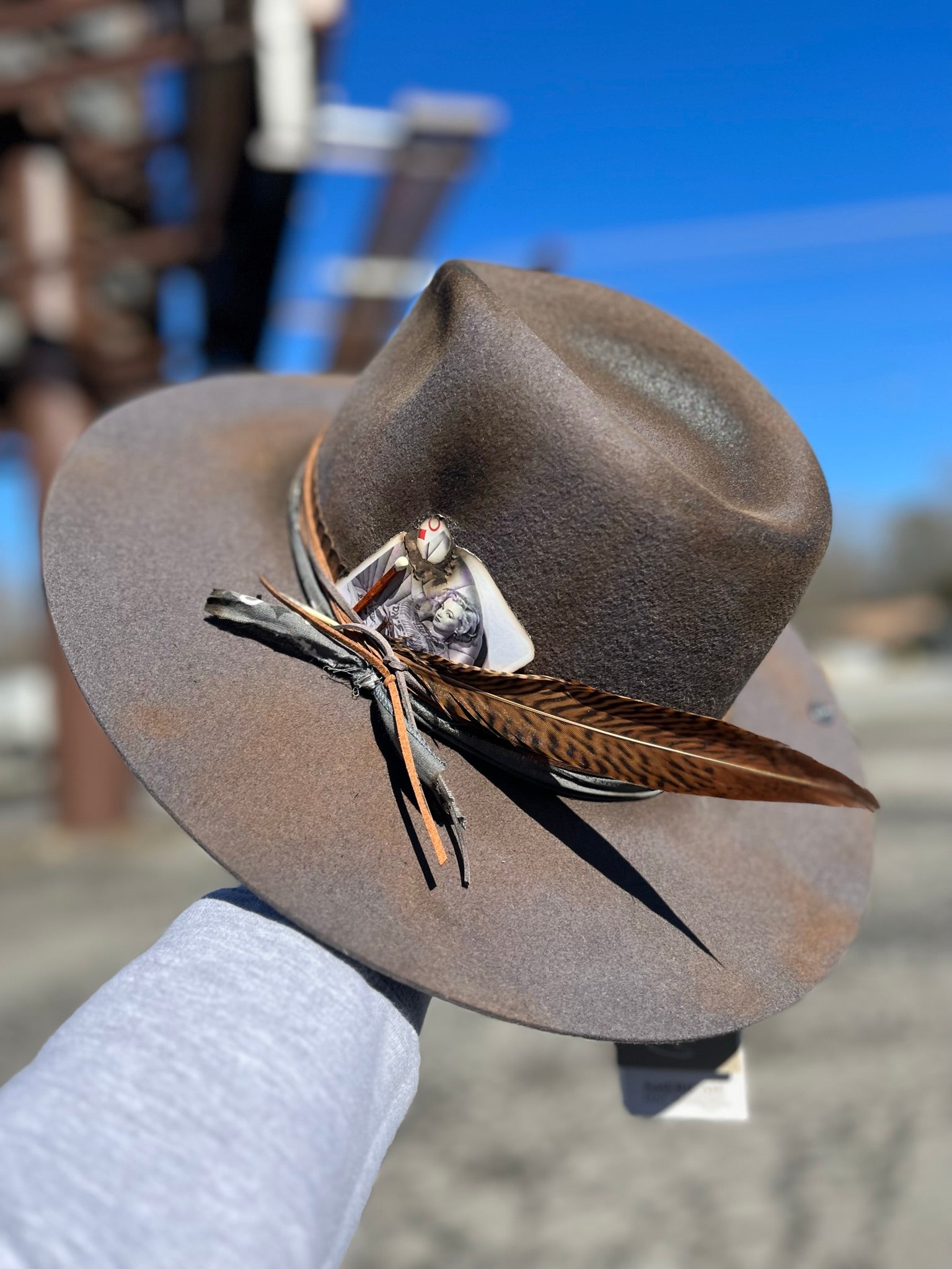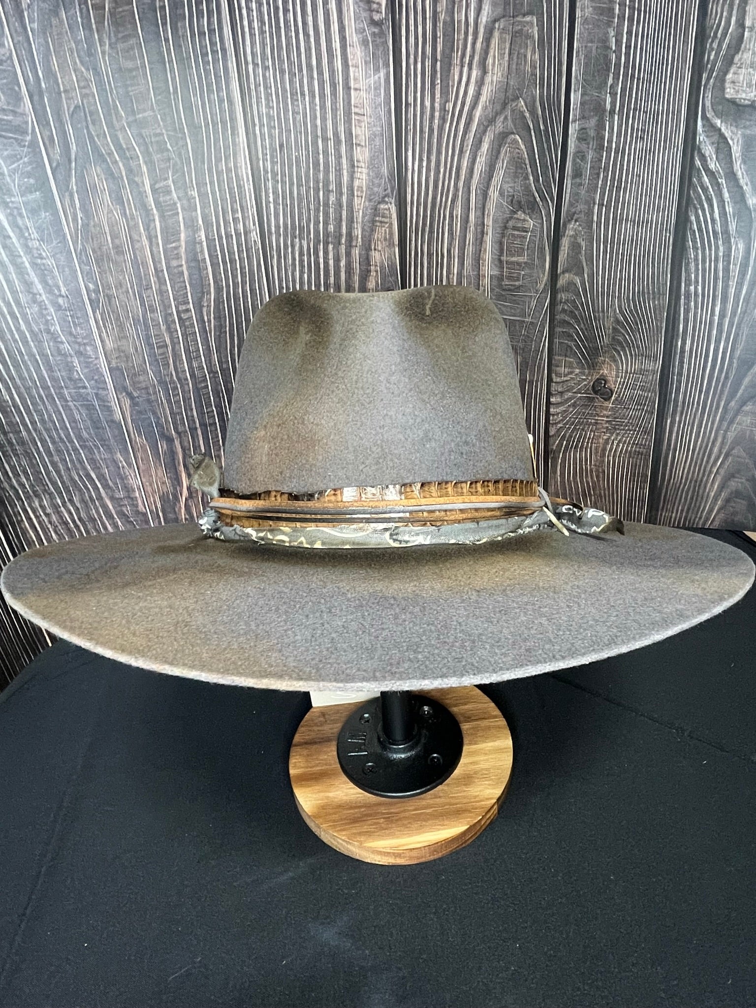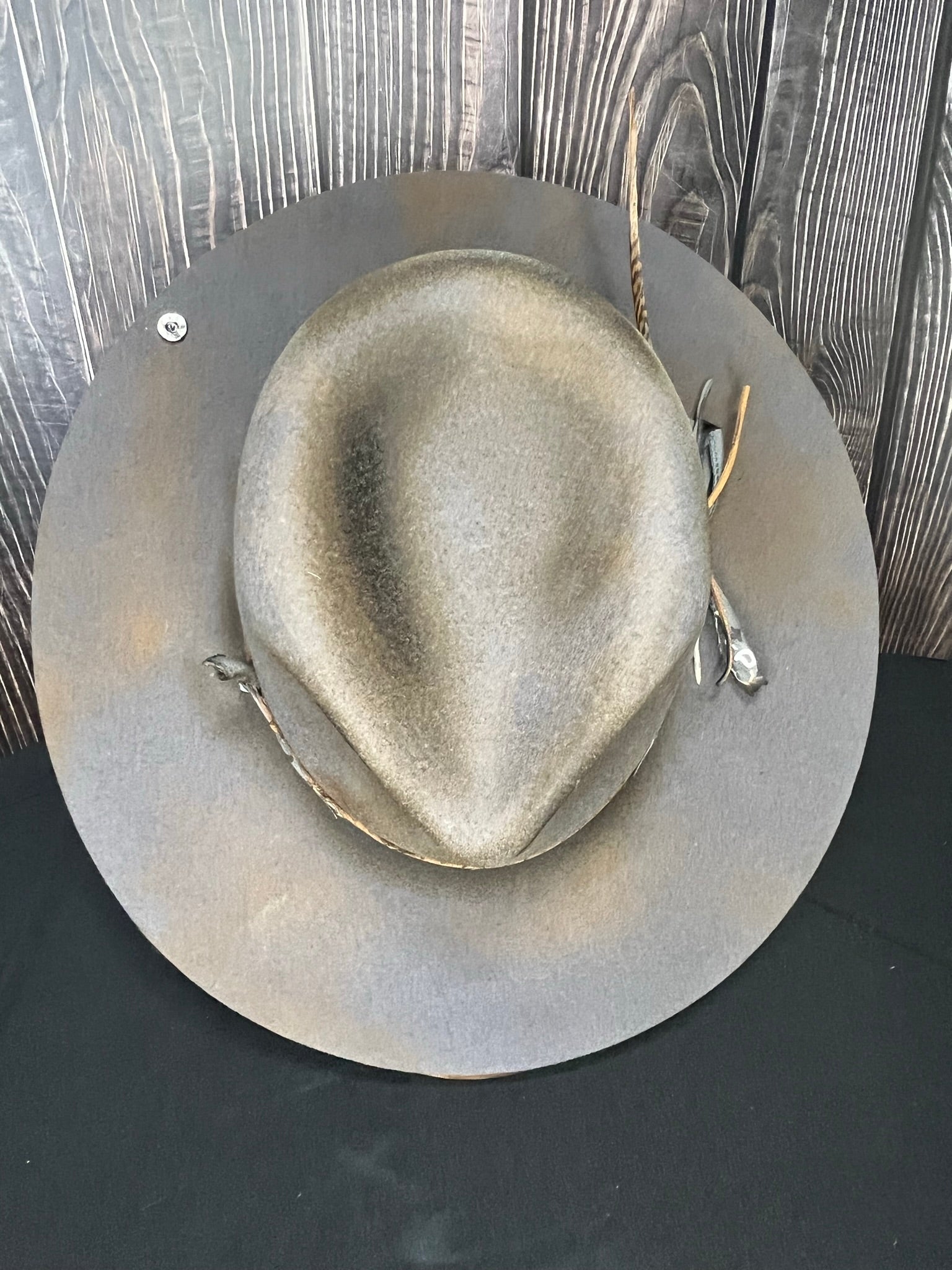 Grey in color, this hat has been accent painted and all over burned. Along with some accent burning. "Take Risks" hand burned onto the back right.